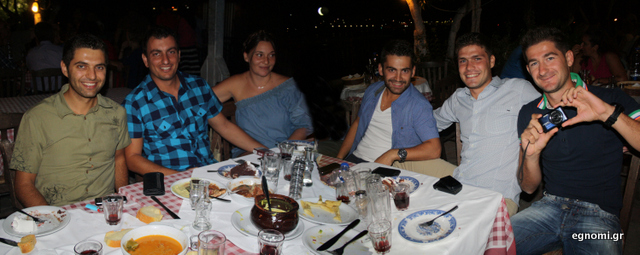 Τα 24 χρόνια του έκλεισε ο Γιάννης Γρηγοριάδης (με το λαδί πουκάμισο) και γιόρτασε με φίλους τα γενέθλιά του πίνοντας κρασάκι και τρώγοντας μεζέδες.