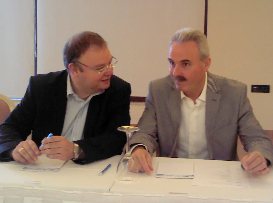 Στόχος των δύο θεματικών συζητήσεων που αναπτύχθηκαν είναι η αναζήτηση συνεργασίας στους τομείς της εκπαίδευσης και της εθελοντικής πυροπροστασίας. Στη φωτογραφία ο Γερμανός Δήμαρχος με τον Βασίλη Βελέντζα, Δήμαρχο Ερέτριας.