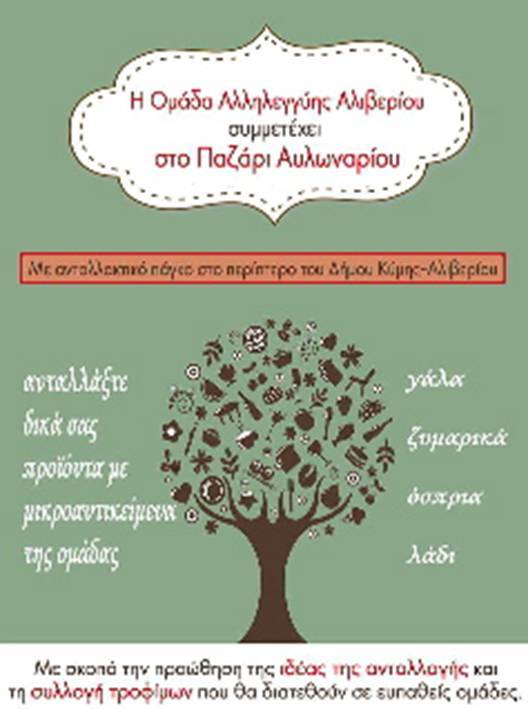 Η Ομάδα Αλληλεγγύης Αλιβερίου συμμετέχει για δεύτερη συνεχόμενη χρονιά στο παζάρι του Αυλωναρίου, από 7 μέχρι 13 Οκτωβρίου, με πάγκο όπου δεν θα πωλούνται προϊόντα, αλλά θα ανταλλάσσονται.