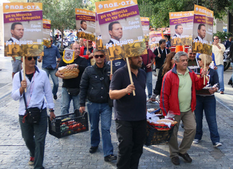 Στο υπουργείο Οικονομικών συγκεντρώθηκαν μέλη της ΠΟΕ-ΟΤΑ, κρατώντας την αφίσα που κυκλοφόρησε η Ομοσπονδία στην οποία εικονίζεται ο Γ.Στουρνάρας με το σύνθημα: «Για τη μανούλα και την πεθερούλα του Γιάννη, ρε γαμώτο».