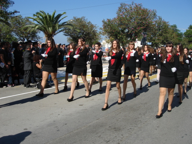 Εκρηκτικός ήταν ο συνδυασμός της μαύρης φούστας και μπλούζας με το κόκκινο φουλάρι πάνω από το λευκό πουκάμισο για τις μαθήτριες του 1ου Γυμνασίου (φωτό κάτω). Στο βήμα, όμως, δεν έσκισαν.