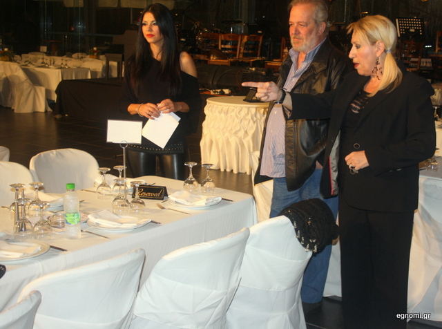Ο αντιδήμαρχος καθαριότητας Βασίλης Καθαροσπόρης αραχτός και light συζητά με τον Φώτη Γκούνη και τη σύζυγό του και αδιαφορεί για το φωτογραφικό φλας.