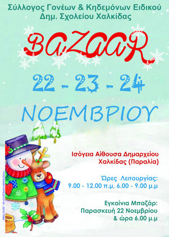 Ο Σύλλογος Γονέων και Κηδεμόνων του Ειδικού Δημοτικού Σχολείου Χαλκίδας διοργανώνει Χριστουγεννιάτικο μπαζάρ, στην ισόγεια αίθουσα του Δημαρχείου, στην παραλία Χαλκίδας.