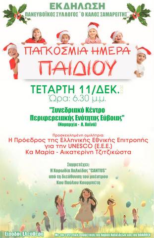 Ο Πανευβοϊκός Σύλλογος " Ο Καλός Σαμαρείτης" διοργανώνει εκδήλωση για την παγκόσμια ημέρα Παιδιού,την Τετάρτη 11 Δεκεμβρίου, στις 6:30 το απόγευμα, στο Συνεδριακό Κέντρο της Περιφερειακής Ενότητας Εύβοιας, σε συνεργασία με την Πρωτοβάθμια και Δευτεροβάθμια εκπαίδευση.