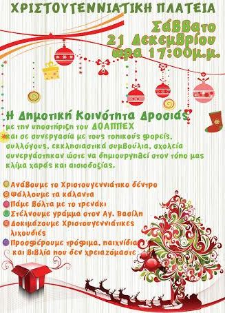 Η Δημοτική Κοινότητα Δροσιάς, σε συνεργασία με τοπικούς φορείς, συλλόγους, εκκλησιαστικά συμβούλια και σχολεία, διοργανώνει Χριστουγεννιάτικη εκδήλωση στην πλατεία της Δροσιάς, το Σάββατο 21 Δεκεμβρίου, στις 5 το απόγευμα.