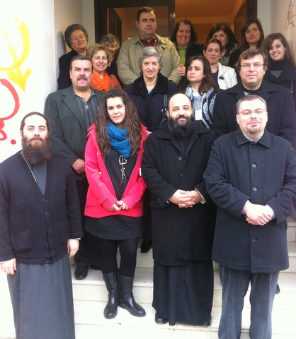Στη φωτογραφία αναμνηστικό στιγμιότυπο, αμέσως μετά τη Θεία Λειτουργία, στην είσοδο του Πνευματικού κέντρου του ιερού ναού Αγίου Δημητρίου Χαλκίδας.
