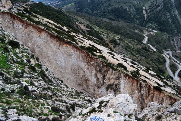 Ο Μύρτος ...κόπηκε στη μέση . Ο Χάρακας, ο γκρεμός ανέμεσα στην πανέμορφη παραλία και το δρόμο, απέκτησε ένα τεράστιο σχίσμα, μια νέα χαράδρα (φωτό κάτω).