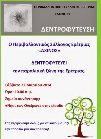 Ο Περιβαλλοντικός Σύλλογος Ερέτριας "Αχινός" διοργανώνει δενδροφύτευση στην παραλιακή ζώνη της Ερέτριας σήμερα Σάββατο 22 Μαρτίου, στις 10 το πρωί. Ως σημείο συνάντησης των εθελοντών, που θα συμμετάσχουν στη δενδροφύτευση, έχει οριστεί η είσοδος του νησιού των Ονείρων.