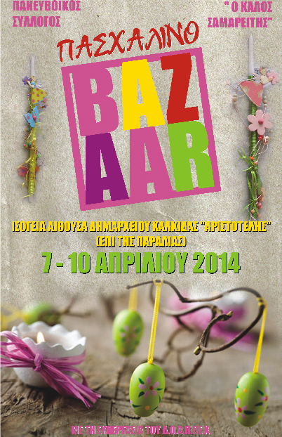 Πασχαλινό μπαζάρ, για την ενίσχυση των σκοπών του, διοργανώνει ο Πανευβοϊκός Σύλλογος "Ο Καλός Σαμαρείτης", στην ισόγεια αίθουσα του Δημαρχείου Χαλκίδας "Αριστοτέλης", στην παραλία της Χαλκίδας.