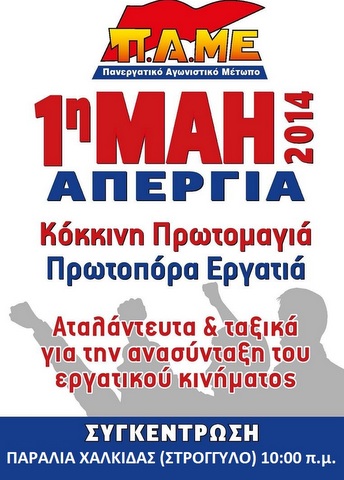 Με ξεχωριστή συγκέντρωση από αυτή του Εργατικού Κέντρου, όπως κάθε χρόνο, γιορτάζει το ΠΑΜΕ ( η συνδικαλιστική παράταξη του ΚΚΕ) την Εργατική Πρωτομαγιά. Το ΠΑΜΕ πραγματοποιεί συγκέντρωση στο στρογγυλό της παραλίας της Χαλκίδας, σήμερα Πρωτομαγιά, στις 10 το πρωί.