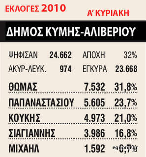 «Μαυρίστηκαν» οι κομματικοί υποψήφιοι στο Δήμο Κύμης-Αλιβερίου. Αποτέλεσμα ήταν να μείνουν εκτός β' γύρου ο Γιάννης Κούκης της ΝΔ, ο Γιάννης Σιαγιάννης του ΠΑΣΟΚ και ο Κώστας Μιχαήλ του ΚΚΕ.