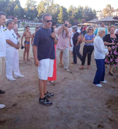 Στη φωτογραφία ο Δήμαρχος Θανάσης Ζεμπίλης, με καλοκαιρινή περιβολή, κατά τη διάρκεια της τελετής ανάρτησης της «Γαλάζιας Σημαίας».