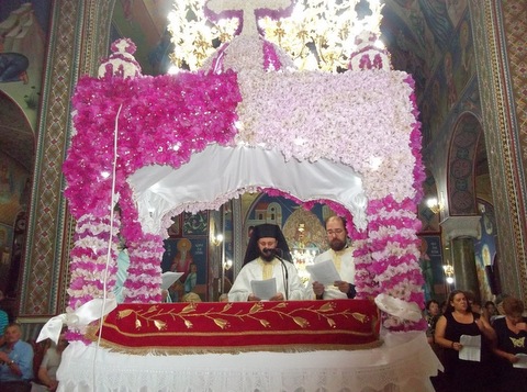 Με λαμπρότητα και μεγαλοπρέπεια, όπως αρμόζει στην Υπεραγία Θεοτόκο πραγματοποιήθηκε και φέτος την παραμονή της αποδόσεως της Κοιμήσεως της Θεοτόκου, ο πανηγυρικός Εσπερινός και τα εγκώμια της Παναγίας, στον ιερό ναό Ευβοέων Αγίων.