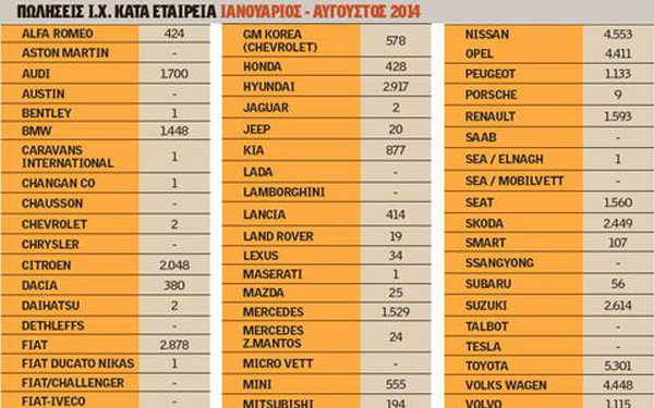 Αύξηση 23,1% σημείωσαν οι κυκλοφορίες νέων επιβατηγών αυτοκινήτων τον Αύγουστο σε σύγκριση με τον αντίστοιχο μήνα του 2013. Οι κυκλοφορίες νέων μοτοσικλετών στο σύνολο της χώρας αυξήθηκαν 4,3%, έναντι πτώσης 19,8% τον Αύγουστο του 2013.