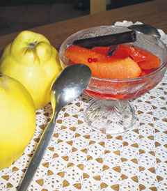 Πλένω και καθαρίζω τα κυδώνια. Τα κόβω σε φέτες, πρώτα στα 4 και μετά στα 8. Σε κατσαρόλα ανακατεύω τα υπόλοιπα υλικά και προσθέτω και τα κυδώνια. Φέρνω σε βρασμό χαμηλώνω και σιγοβράζω μέχρι να μαλακώσουν. Τα τοποθετώ σε γυάλινο μπολ και φυλάω στο ψυγείο.