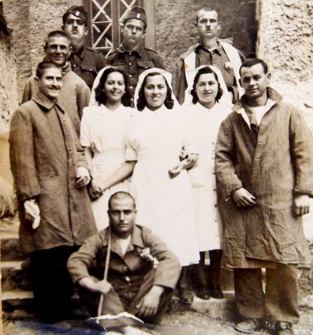 " Η Μαρία Σταύρου(στη μέση) εθελόντρια στον Ερυθρό Σταυρό το Σαράντα!Στη φωτογραφία βρίσκεται με τραυματίες πολέμου στο 4° Δημοτικό σχολείο ( δεν υπάρχει πια)το οποίο είχαν επιτάξει και μετατρέψει σε νοσοκομείο. Σήμερα η γιαγιά η Μαρία είναι 94 ετών, με διαύγεια πνεύματος ,υγιέστατη και ..κοκέτα!"