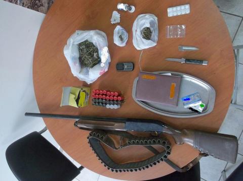 Μία κυνηγετική καραμπίνα, την οποία κατείχε παράνομα, μία δερμάτινη φυσιγγιοθήκη και 30 φυσίγγια, ένα πτυσσόμενο στιλέτο, μήκους 22 εκατοστών, 22,5 γραμμάρια ηρωίνης, 95,3 γραμμάρια ακατέργαστης κάνναβης και 12,5 ναρκωτικά δισκία, για την αγορά των οποίων απαιτείται ιατρική συνταγή.