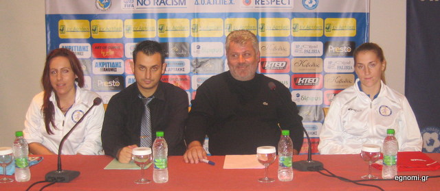 Σε πρώτο πλάνο οι δυο αρχηγοί της γυναικείας ομάδας ποδοσφαίρου της Χαλκίδας, η Κηρύκου και η Τσώκου που κάθισαν στο πάνελ της συνέντευξης μαζί με τον προπονητή Θανάση Πύθουλα για να πουν τους στόχους της ανανεωμένης ομάδας