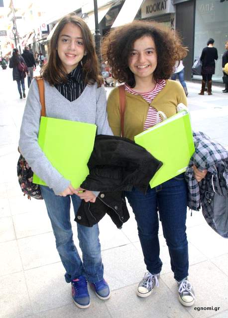 Χαμογελαστές και κρατώντας από ένα λαχανί φάκελο στο χέρι να περπατάνε στην Αβάντων, «συνέλαβε» ο φακός του egnomi.gr τις νεαρές φίλες Μαρία Μακρυκώστα και Αντριάννα Παππά (φωτό),