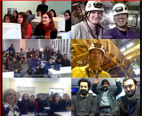 Στη φωτογραφία στιγμιότυπο της Εικονικής περιήγησης με τα συμμετέχοντα σχολεία: 11ο ΓΕΛ Περιστερίου, 2ο ΓΕΛ Βριλησσίων, ΓΕΛ Αυλωναρίου Ευβοίας και τους επιστήμονες του CERΝ: Νοemi (CMS), Χρήστο Λαζαρίδη (CMS), Αντώνη Παπανέστη (LHCb), Άγγελο Αλεξόπουλο(Τμήμα Εκπαίδευσης), Αντώνη Αγαπητό (CMS), Zoltan (CMS)