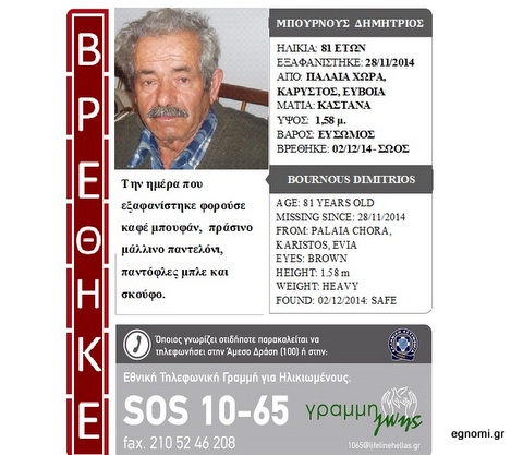 Αίσιο τέλος είχε η περιπέτεια του Δημητρίου Μπουρνούς, ηλικίας 81 ετών, ο οποίος εξαφανίστηκε την Παρασκευή 28 Νοεμβρίου από την Κάρυστο, αλλά ευτυχώς βρέθηκε δίνοντας τέλος στην αγωνία των δικών του ανθρώπων που τον αναζητούσαν.