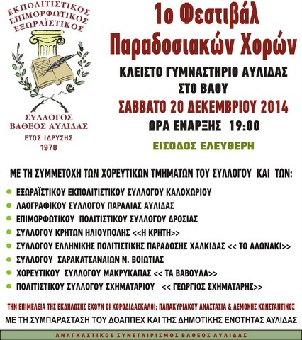 Ο Εκπολιτιστικός- Επιμορφωτικός-Εξωραϊστικός Σύλλογος Βαθέος Αυλίδας διοργανώνει σήμερα Σάββατο 20 Δεκεμβρίου, στις 7 το απόγευμα, το 1ο φεστιβάλ παραδοσιακών χορών, στο κλειστό γυμναστήριο Αυλίδας, στο Βαθύ.