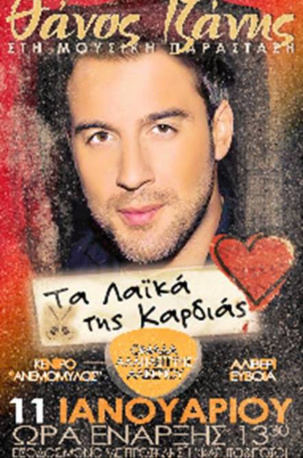 Ο τίτλος της μουσικής παράστασης είναι "Τα λαϊκά της Καρδιάς" και περιλαμβάνει πλήρες μενού και απεριόριστο κρασί! Είσοδος μόνο με πρόσκληση, την οποία μπορείτε να προμηθευτείτε μέχρι τις 4 Ιανουαρίου. Πληροφορίες στα τηλ. 69743 53581, 69471 24178.