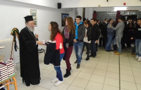 Ο Σεβασμιώτατος δεξιώθηκε τούς φοιτητές, είχε την ευκαιρία να τούς συγχαρεί προσωπικά για την επιτυχία της εισαγωγής τους στην τριτοβάθμια Εκπαίδευση, να συζητήσει μαζί τους, να τους διανείμει ως ελάχιστη ευλογία, ένα βιβλίο της Καινής Διαθήκης, καθώς και το Ημερολόγιο 2015 της Ιερής Μητρόπολης.