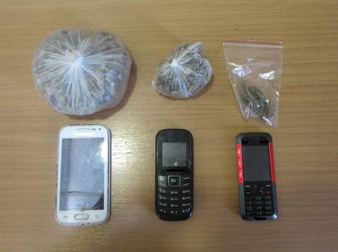 Στη φωτογραφία τα ναρκωτικά και τα κινητά τηλέφωνα που βρέθηκαν στην κατοχή των συλληφθέντων.