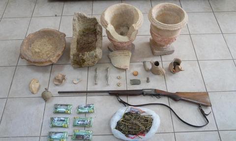 Στο σπίτι βρέθηκαν ακόμη ναρκωτικά και ένα κυνηγετικό όπλο, το οποίο κατείχε παράνομα, με αποτέλεσμα να σχηματιστεί δικογραφία σε βάρος του για παράβαση νομοθεσίας «Περί Προστασίας Αρχαιοτήτων και εν γένει της Πολιτιστικής Κληρονομιάς», κατοχή και καλλιέργεια ναρκωτικών, παράβαση νομοθεσίας περί τελωνειακού κώδικα και λαθρεμπορίας, καθώς και παράνομη οπλοκατοχή.