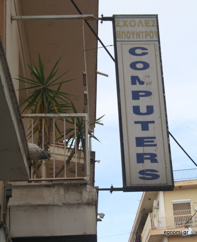 Από την εποχή εκείνη ( πρέπει να έχουν περάσει πάνω από 20 χρόνια) είναι ξεχασμένη η ταμπέλα που βλέπετε στη φωτογραφία και βρίσκεται σε κτήριο της οδού Αντωνίου, όπου φυσικά δεν στεγάζεται σήμερα καμία σχολή "computers".