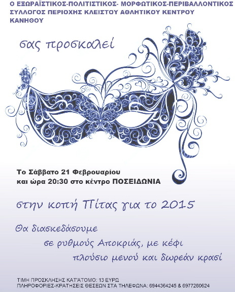 Ο Εξωραϊστικός-Πολιτιστικός-Μορφωτικός-Περιβαλλοντικός Σύλλογος της διοργανώνει εκδήλωση για την κοπή της βασιλόπιτας, το Σάββατο 21 Φεβρουαρίου, στο κέντρο "Ποσειδωνία".