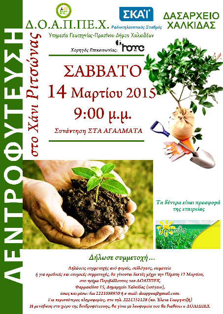 Το Σάββατο 14 Μαρτίου θα πραγματοποιηθεί τελικά η δενδροφύτευση στη Ριτσώνα, που διοργανώνει ο Δημοτικός Οργανισμός Άθλησης Πολιτισμού και Περιβάλλοντος Χαλκίδας (ΔΟΑΠΠΕΧ), σε συνεργασία με το ραδιοτηλεοπτικό σταθμό ΣΚΑΪ και το Δασαρχείο Χαλκίδας.