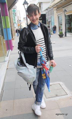 Ο Δημήτρης Γιοβάνης είναι 15 ετών και μην φανταστείτε ότι η παιδική ομπρέλα που κρατάει είναι δική του. Απλώς, όταν έφευγε από το σπίτι του είδε τη βροχή και βιαστικός καθώς ήταν πήρε την πρώτη ομπρέλα που είδε μπροστά του.