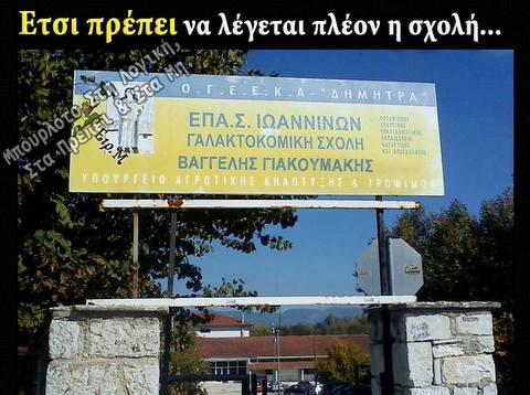 Ομάδα φοιτητών προτείνει την μετονομασία της Γαλακτοκομικής Σχολής Ιωαννίνων σε Σχολή "Βαγγέλης Γιακουμάκης". Μάλιστα έχει ήδη φτιαχτεί και σχετική σελίδα στο facebook, όπου δεσπόζει η φωτογραφία που βλέπετε, η οποία αποτελεί προφανώς φωτομοντάζ της πινακίδας της Σχολής.