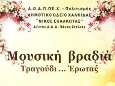 Το Δημοτικό Ωδείο «Ν. Σκαλκώτας» διοργανώνει μουσική βραδιά, με τίτλο «Τραγούδι...Έρωτας» την Κυριακή 26 Απριλίου, στις 8 το βράδυ, στο Δημοτικό Θέατρο Παπαδημητρίου, με είσοδο ελεύθερη για το κοινό.