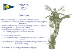 Το βιβλίο θα παρουσιαστεί την Παρασκευή 24 Απριλίου, στις 7:30 το απόγευμα, στα γραφεία του Ιστιοπλοϊκού Ομίλου Χαλκίδας, (Λεωφόρος Παπαστρατή 1, Όρμος Βούρκου, Χαλκίδα)