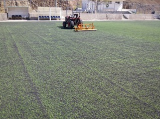 Συγκεκριμένα, με το ειδικό μηχάνημα, που προμηθεύτηκε πρόσφατα ο ΔΟΑΠΠΕΧ, προχώρησε στην ανόρθωση του πέλους του συνθετικού χλοοτάπητα του γηπέδου και παράλληλα έγινε και κοπή των χόρτων εσωτερικά και εξωτερικά της περιμέτρου του γηπέδου.