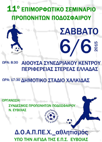 Ο Σύνδεσμος προπονητών Ποδοσφαίρου Εύβοιας διοργανώνει σεμινάριο για προπονητές ποδοσφαίρου στη Χαλκίδα το Σάββατο 6 Ιουνίου. Οι εργασίες του σεμιναρίου θα ξεκινήσουν στις 8:30 το πρωί στο συνεδριακό κέντρο του Διοικητηρίου της Χαλκίδας.
