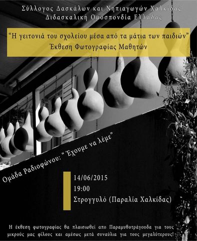 Ο Σύλλογος Δασκάλων-Νηπιαγωγών Χαλκίδας και η ομάδα ραδιοφώνου διοργανώνουν έκθεση φωτογραφίας με τη συμμετοχή σχολείων και νηπιαγωγείων της Χαλκίδας, στο Στρογγυλό της παραλίας, την Κυριακή 14 Ιουνίου, στις 7:30 το βράδυ.