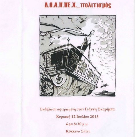Ο Δημοτικός Οργανισμός Άθλησης, Πολιτισμού και Περιβάλλοντος Χαλκίδας (ΔΟΑΠΠΕΧ) διοργανώνει εκδήλωση αφιερωμένη στο Γιάννη Σκαρίμπα την Κυριακή 12 Ιουλίου, στις 8:30 το βράδυ, στο Κόκκινο Σπίτι.