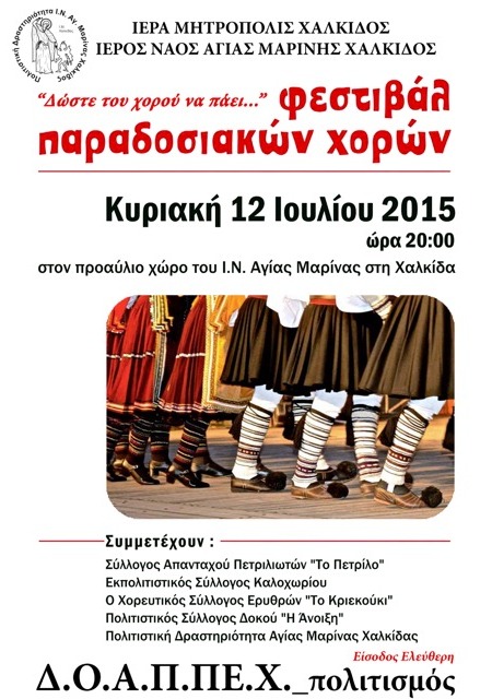 Η Πολιτιστική Δραστηριότητα του ιερού ναού Αγίας Μαρίνας Χαλκίδας διοργανώνει ένα πολύχρωμο Φεστιβάλ Παραδοσιακών Χορών την Κυριακή 12 Ιουλίου, στις 8 το βράδυ, στον προαύλιο χώρο του ιερού ναού, με τίτλο "Δώστε του Χορού να πάει...".