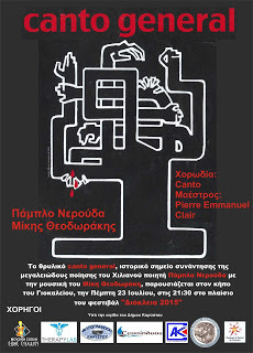 Το θρυλικό Canto General, ιστορικό σημείο συνάντησης της μεγαλειώδους ποίησης του Χιλιανού ποιητή Πάμπλο Νερούδα με τη μουσική του Μίκη Θεοδωράκη, παρουσιάζεται στον κήπο του Γιοκαλείου ιδρύματος, στην Κάρυστο, την Πέμπτη 23 Ιουλίου, στις 9 το βράδυ, στα πλαίσια του Φεστιβάλ Χορωδιών "Διόλκεια 2015".