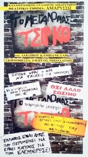 Η θεατρική ομάδα "Αμαρύσσω" παρουσιάζει το έργο "Το μεγάλο μας τσίρκο" του Ιάκωβου Καμπανέλλη, σε σκηνοθεσία Γιώργου Νικολαΐδη, σε δύο παραστάσεις, την Παρασκευή 31 Ιουλίου και την Κυριακή 2 Αυγούστου, στην Αμάρυνθο και στη Ερέτρια.