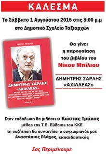 Το Σάββατο 1 Αυγούστου, στις 8 το βράδυ, στο Δημοτικό Σχολείο Ταξιαρχών, θα γίνει η παρουσίαση του βιβλίου του Νίκου Μπίλιου "Δημήτρης Σάρλης "Αχιλλέας". Στην εκδήλωση θα μιλήσει ο Κώστας Τράκος, μέλος της Τοπικής Επιτροπής Εύβοιας του ΚΚΕ.