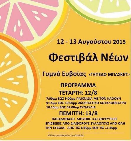 Ο Σύλλογος της Ομάδας Νέων του Γυμνού Εύβοιας διοργανώνει φεστιβάλ νέων στο Γυμνό, την Τετάρτη 12 και την Πέμπτη 13 Αυγούστου. Το φεστιβάλ θα πραγματοποιηθεί στις εγκαταστάσεις του γηπέδου μπάσκετ του χωριού.