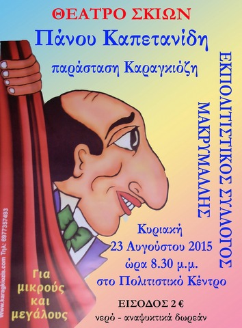 Ο Εκπολιτιστικός Σύλλογος Μακρυμάλλης, όπως κάθε χρόνο, διοργανώνει πολιτιστικές εκδηλώσεις και φέτος τον Αύγουστο. Η αρχή γίνεται την Κυριακή 23 Αυγούστου, στις 8:30 το βράδυ, στο Πολιτιστικό Κέντρο, όπου θα παρουσιαστεί παράσταση Καραγκιόζη με τον Πάνο Καπετανίδη.