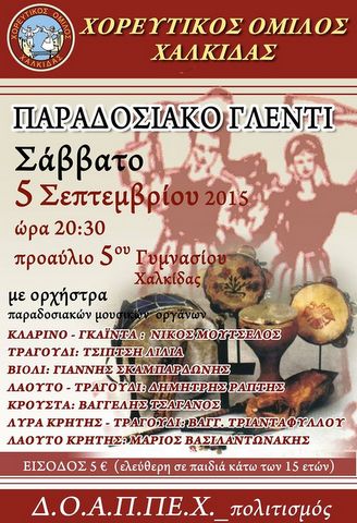 Ο ΔΟΑΠΠΕΧ διοργανώνει παραδοσιακό γλέντι, με τον Χορευτικό Όμιλο Χαλκίδας και ορχήστρα παραδοσιακών μουσικών οργάνων, το Σάββατο 5 Σεπτεμβρίου, στις 8:30 το βράδυ, στο προαύλιο του 5ου Γυμνασίου Χαλκίδας.