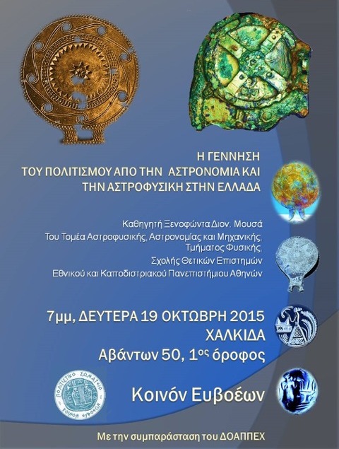 Το Πολιτιστικό Σωματείο "Κοινόν Ευβοέων" διοργανώνει εκδήλωση με τίτλο "Η Γέννηση του Πολιτισμού από την Αστρονομία και την Αστροφυσική στην Ελλάδα", την Δευτέρα 19 Οκτωβρίου, στις 7 το απόγευμα, στην αίθουσα διαλέξεων του Δήμου Χαλκιδέων (οδός Αβάντων 50, 1ος όροφος).
