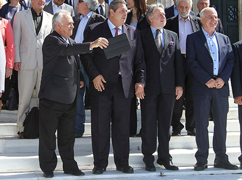 Στις φωτογραφίες ο υπουργός Εργασίας φαίνεται ξεκάθαρα να πατάει στις μύτες των παπουτσιών του προκειμένου, πιθανότατα, να πετύχει να είναι στο ίδιος ύψος με τους δύο διπλανούς του υπουργούς, τον Πάνο Καμμένο και τον Βαγγέλη Αποστόλου.